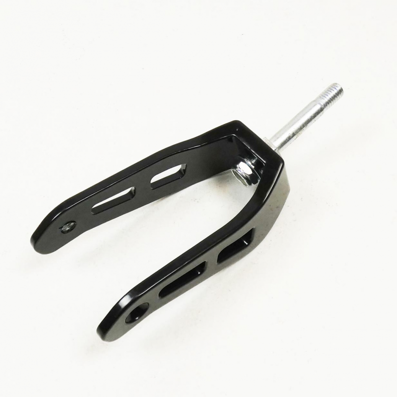 Horquilla delantera resistente y duradera, fabricada para ofrecer estabilidad y control óptimos en la dirección de la silla eléctrica.