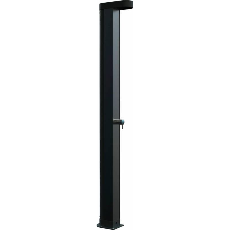Solardusche mit Sprühgerät und Nofer-Einhebelmischer. Leder aus grauem Aluminium, Chromspritzer und Kunststoffteile. Einhebelmischer mit Warm- und Kaltwasserregelung. Aluminiumtank mit 30 l Fassungsvermögen. Schneller Wasserzulaufanschluss. Mit Ablassschraube. Es verfügt über zwei eingebaute Anker. Die Höhe des Sprinklers zum Boden beträgt 2,07 m. Seine Abmessungen betragen 2125 mm Höhe und 350 mm Breite