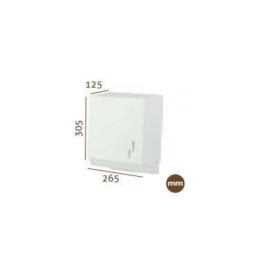 Papierhandtuchspender aus weiß lackiertem Stahl. 400-600 Handtücher. Fehlender Inhaltsbetrachter. Sicherheitsschloss mit Schlüssel. Reißfeste Kante mit Extraktionskante, die das Zerreißen von Handtüchern und Händen verhindert. Beinhaltet Hardware. Maße: 265x305x125mm.