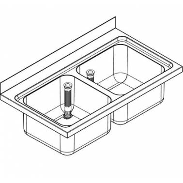 Industriewand oder eingebaute Spüle aus satiniertem Chrom-Nickel-Stahl mit zwei 1200-mm-Becken, Modell MAXIMA, Marke Franke. Es hat eine Materialstärke von 1,0 mm, eine geschweißte Schüssel ohne Fugen, ohne Überlauf und mit 80 mm Hahnregal, 1 1/2 "Ablassventil und zweiteiligem Überlaufrohr, nahtlose Rückwand 100 mm hoch wie Spritzschutz, Konsolen als Sonderausstattung, mit Löchern für die Wandmontage. Seine Abmessungen betragen 1200x432x700 mm (AxAxP)
