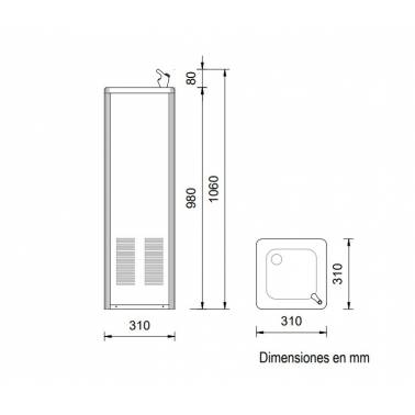 Kaltwasserbrunnen mit Druckknopfhahn aus satiniertem Edelstahl AISI 304 mit einem Fassungsvermögen von 25 Litern und einem 2-Liter-Nofer-Innentank zur Kaltwasserspeicherung. Es verfügt über einen Thermostat zur Regelung der Auslasswassertemperatur. Exklusives Design, das Probleme mit Flüssigkeitsstagnation im Kreislauf beseitigt. Über die Frontplatte ist sowohl die Kühlung als auch das elektrische System leicht zugänglich. Korrosionsschutzgarantie für Kupferrohre. Die Kompressorleistung beträgt HP 1/12. Leistung: 100 W. Spannung 230 V - 50 Hz. R 134a Gaskühlung. Der Wasserbrunnen ist robust, vandalensicher und sicher, da er ohne scharfe Kanten, scharfe Kanten oder andere gefährliche Elemente gebaut ist. Geeignet für Gemeinden und öffentliche Innenbereiche mit hoher Nutzungshäufigkeit. Seine Abmessungen betragen 980x310x310mm (Höhe x Breite x Tiefe)