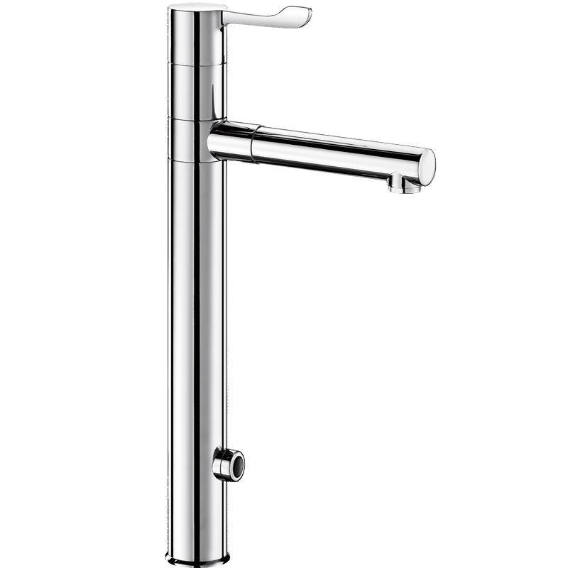 El Grifo mezclador electrónico Tempomatic Mix con caño orientable H.300 y 2 caños Bioclip de acero inoxidable, marca Delabie, es una solución avanzada para entornos comerciales y de atención médica que requieren máxima higiene y funcionalidad. Este grifo mezclador electrónico de fregadero cuenta con un caño alto orientable desmontable Bioclip de 300 mm de altura y viene suministrado con dos caños desmontables de acero inoxidable de 185 mm de longitud y un diámetro de 28 mm, lo que ofrece versatilidad y facilidad de mantenimiento. Equipado con una caja de control electrónica IP65 independiente y alimentado por red eléctrica con un transformador 230/12V, garantiza un funcionamiento seguro y confiable en entornos exigentes. Con un caudal limitado a 7 l/min a 3 bar, cumple con las normativas de eficiencia de agua, promoviendo un uso responsable de los recursos hídricos. Tanto el cuerpo como el caño del grifo presentan un interior liso que limita la acumulación de bacterias, asegurando una higiene óptima en todo momento. Además, cuenta con un sistema de descarga periódica ajustable, que evita que el agua se estanque en las canalizaciones en caso de no utilizarse durante períodos prolongados. Equipado con un detector de presencia infrarrojo antigolpes, garantiza un funcionamiento sin contacto y duradero. El cuerpo y el caño de latón macizo cromado ofrecen resistencia y durabilidad, con fijación reforzada mediante dos varillas de acero inoxidable. El ajuste de temperatura se realiza mediante una maneta Hygiène L.100, que facilita su uso y control. Los latiguillos flexibles de PEX con filtros y electroválvulas M3/8" aseguran un flujo de agua limpio y seguro en todo momento. Con seguridad antibloqueo del flujo continuo y electroválvulas en la entrada de la cámara mezcladora, este grifo garantiza un funcionamiento óptimo y sin interrupciones. Ofrece dos modos de cierre: modo estándar con flujo temporizado y cierre automático, y modo ON/OFF con cierre voluntario o después de 30 minutos de salida de agua. En modo ON/OFF, la célula de detección se coloca en el lateral del grifo mezclador, ofreciendo flexibilidad en su instalación y uso. Con su diseño robusto, funcional y adaptado para entornos sanitarios y comerciales, el Grifo mezclador electrónico Tempomatic Mix con caño orientable y 2 caños Bioclip de acero inoxidable es la elección ideal para establecimientos que requieren lo mejor en términos de higiene, eficiencia y comodidad.