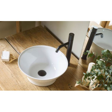 Grifo de lavabo alto modelo Milos en negro mate, con medidas de 330 mm de alto y 52 mm de diámetro. Perfecto para lavabos sobre encimera, brindando un toque exclusivo al baño.