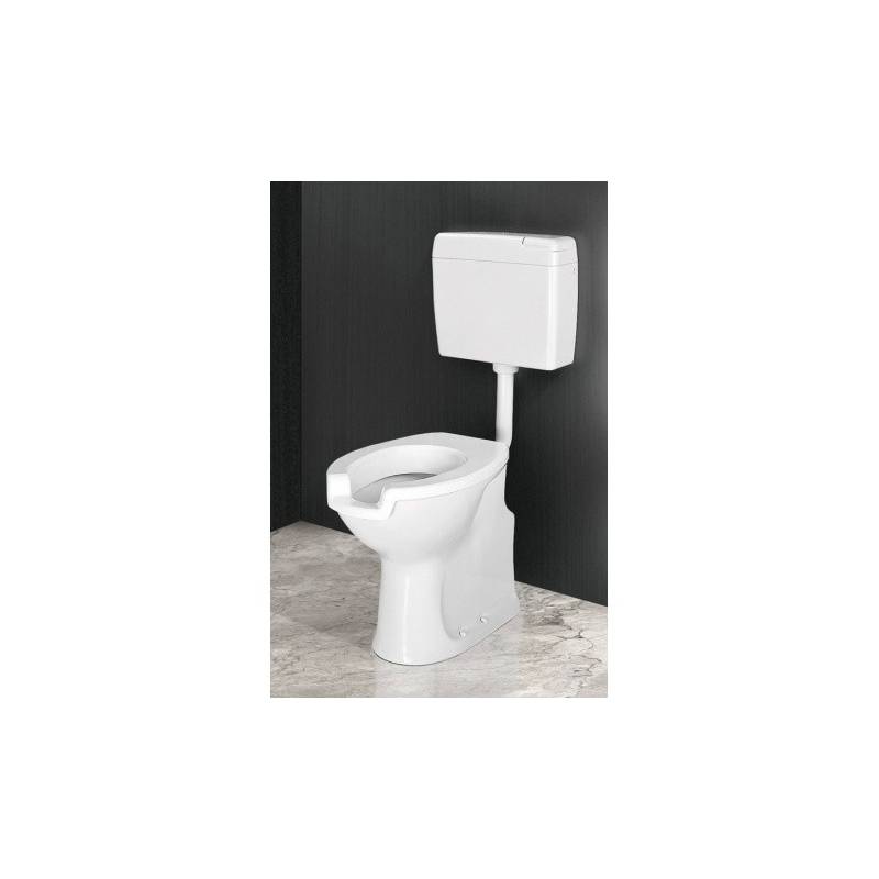 Ergonomische Toilette mit Spülkasten und Sitz mit Frontöffnung Modell PrestoWash 730. Sie hat eine hohe Höhe, um den Transfer des Rollstuhls zur Toilette zu erleichtern. Toilette aus Porzellan mit Bodenverlegung und Doppelauslass (Boden oder Wand). Das Glas ist länglich und hat ein ergonomisches Design, um Menschen mit eingeschränkter Mobilität zu helfen. Lieferung mit externem Spülkasten aus ABS mit Doppelentladung ohne Fernpulsation und mit Sitz.