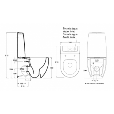 Inodoro para Tanque Bajo Hide Rimless Salida Vertical marca Valadares: Inodoro sin borde con salida vertical, diseñado para instalación con tanque bajo, ofreciendo un diseño moderno y fácil de limpiar.