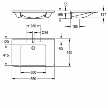 El lavabo individual a pared MEDICARE con 1 orificio para grifería de Franke KWC destaca por su diseño ergonómico y máxima funcionalidad. Fabricado en material mineral MIRANIT aglomerado con resina, su superficie lisa y no porosa es resistente al calor (hasta 80 °C) y extremadamente fácil de limpiar, contribuyendo a la máxima higiene. Con un acabado en Blanco Alpino elegante y luminoso, este lavabo es accesible para personas en sillas de ruedas gracias a su parte inferior abierta y su diseño sin juntas. Cuenta con estantes laterales prácticos, cubeta moldeada sin costuras, sin rebosadero y un orificio para grifería de 35 mm que permite la instalación de mezcladores o grifos monomando. Incluye protector trasero contra salpicaduras y herrajes para montaje en pared, lo que asegura estabilidad y fácil instalación. Dimensiones totales: 850 x 150 x 550 mm (An x Al x Pr). Dimensiones cubeta: 500 x 117 x 415 mm. La solución perfecta para espacios que requieren accesibilidad, durabilidad y estética impecable.