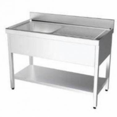 Industrielle Spüle aus Edelstahl mit 1 Becken und 1 Abtropffläche rechts, Maße 1400 x 550, mit Rahmen und Ablage, Marke Nofer.