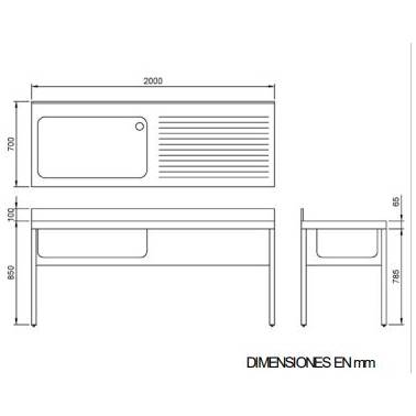 Industrielle Spüle aus Edelstahl mit 1 Becken und 1 Abtropffläche rechts, Maße 2000 x 700, mit Rahmen und Ablage, Marke Nofer.
