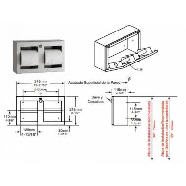 Doppelrollenhalter zum Einbau in die Wand TrimLine Bobrick Series. Es ist in einem einzigen Stück satiniertem ASI 304 Edelstahl geschweißt. Zum Nachfüllen des Papierspenders benötigen Sie einen Schlüssel, der zusammen mit dem Rollenhalter geliefert wird. Der Schaft der Toilettenpapierrollen besteht aus Edelstahl und ist gegen Diebstahl geschützt. Seine Abmessungen betragen 345 mm x 215 mm x 115 mm.