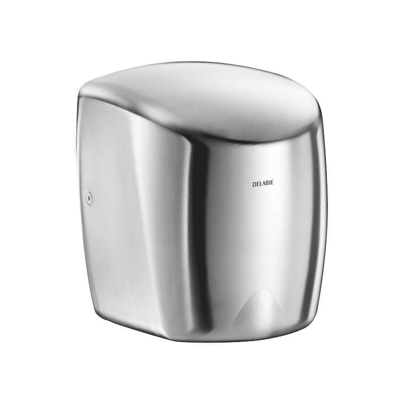 Automatischer Highflow-Impulsluft-Händetrockner aus satinpoliertem Edelstahl, Marke Delabie. Sorgt für schnelles und angenehmes Trocknen mit einem eleganten und langlebigen Finish.
