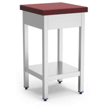 Faserhackblock mit einem Rock von 700 x 500 x 900 mm in Rot. Polyethylenqualität P-500, 50 mm dick. Hergestellt mit einem Rahmen aus Edelstahlrohr, schalldichten Edelstahlblechregalen und ohne eingeklebtem Holz. Verstellbare Füße für mehr Stabilität und Komfort auf jedem Boden