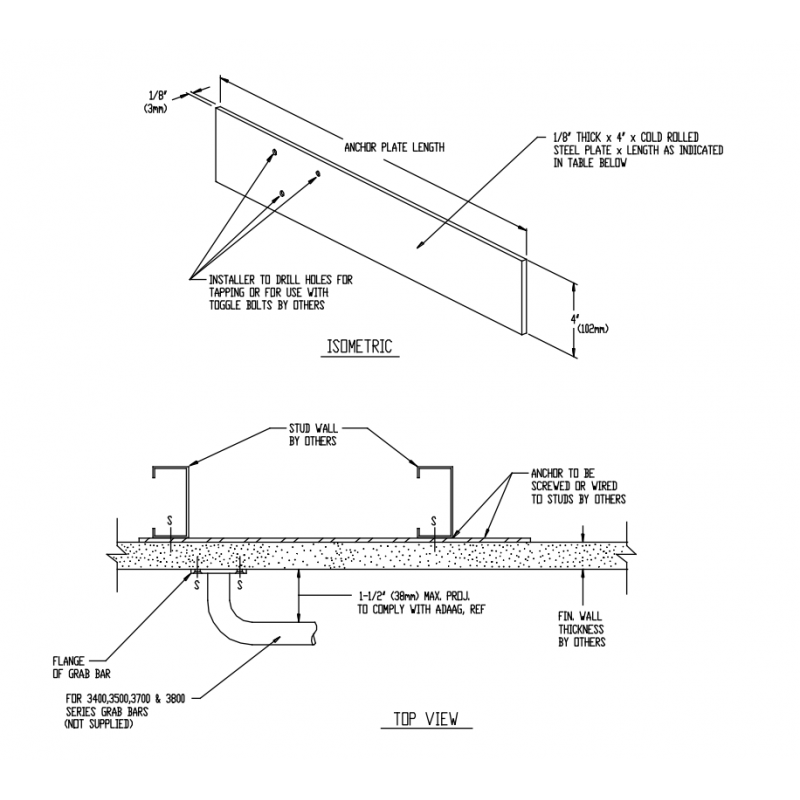 Placa de anclaje de alta resistencia para la instalación segura de barras de agarre de 42" (1067 mm) en paredes con montantes, asegurando una fijación estable y confiable. Diseñada para ser utilizada con barras de agarre con bridas de montaje expuestas y a presión de las series ASI 3300, 3400, 3500, 3700 y 3800. Fabricada con chapa de acero de 1/8" (3 mm) de grosor y un ancho de 4" (102 mm), proporcionando un soporte robusto y duradero. Su diseño optimiza la distribución de la carga, aumentando la seguridad y resistencia de la instalación. Ideal para su uso en baños accesibles, hospitales, residencias y espacios donde se requiera un soporte reforzado para barras de agarre.