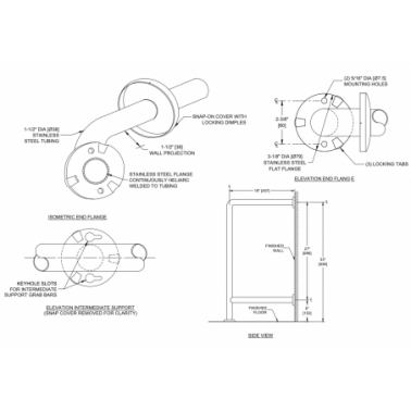 Barra de apoyo de pared a suelo de 18” x 33” (457 x 838 mm) con brida de encaje y superficie texturizada, diseñada para mejorar la seguridad y accesibilidad en baños y espacios públicos. Construida en acero inoxidable tipo 304 con acabado satinado, esta barra proporciona una excelente resistencia a la corrosión y un diseño sofisticado. Su tubo texturizado de 1-1/2" de diámetro permite un mejor agarre, especialmente en ambientes húmedos. La brida de montaje oculta, con un diámetro exterior de 3-1/8” (79 mm) y un espesor de 1/8” (3 mm), cuenta con 2 orificios para tornillos y 3 hoyuelos de bloqueo que garantizan una instalación robusta y duradera. La cubierta de acero inoxidable calibre 22 de 3-3/16” (81 mm) oculta los tornillos, proporcionando un acabado limpio y profesional. Recomendada para aplicaciones en hospitales, residencias y baños accesibles.