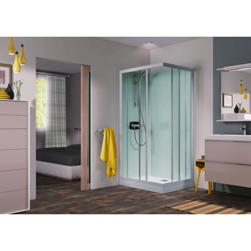 Están equipadas con 2 puertas correderas de cristal de seguridad, paneles de fondo de cristal y grifería termostática. Los rodamientos inferiores de las puertas se pueden declipsar para facilitar la limpieza. De instalación reversible, se montan en pocos minutos gracias a un ingenioso sistema de anclaje de paneles.