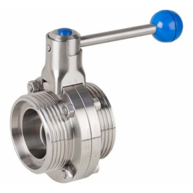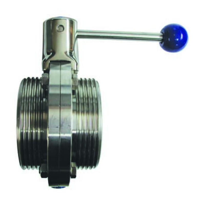 Válvula mariposa extremos roscados. Cuerpo: acero inoxidable AISI 304. Elastómero: EPDM (otro material consultar). Extremos roscados DIN 11851. Presión máxima de trabajo: 10 bar. Temperatura máxima: 120ºC. Accionamiento manual: 3 posiciones.