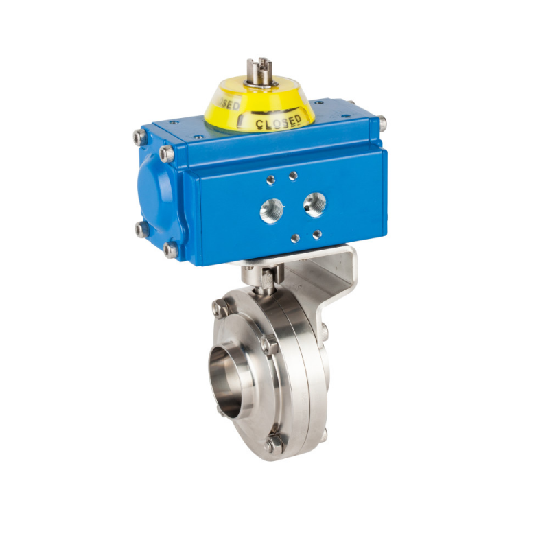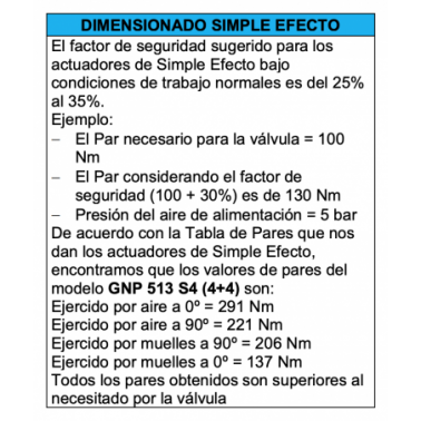 Válvula 2943E 1" 1/2 con actuador GNP-24/S4 marca Genebre. Válvula mariposa extremos soldar/soldar. Cuerpo: acero inoxidable AISI 304. Elastómero: EPDM. Extremos: soldar/soldar. Presión máxima de trabajo: 10 bar. Temperatura máxima: 120ºC. Accionamiento manual: 3 posiciones. Con actuador GNP. Cuerpo de aluminio extruido según ASTM 6005, con anodizado duro como protección a la corrosión interna y externa, con fino acabado interno del cilindro para obtener un bajo coeficiente de fricción, y posteriormente pintado externo con pintura de poliéster en polvo color azul. El diseño compacto de piñón y cremallera doble permite un ensamblaje simétrico, un largo ciclo de vida, así como una rotación en sentido inverso (en este caso tan solo hay que realizar una simple inversión de los pistones). Múltiples guías y rodamientos en cremallera y pistones que reducen la fricción, con largo ciclo de vida y diseño anti-expulsión del eje. Diseño modular del cartucho con resorte precargado y revestido para mayor versatilidad, mayor seguridad y mayor resistencia a la corrosión. Dientes completamente mecanizados en pistón y en piñón para una máxima eficacia y un mínimo contragolpe entre piñón y cremallera. Fijadores en acero inoxidable para una mayor resistencia a la corrosión. Conformidad completa con las últimas especificaciones: ISO5211, DIN 3337 y NAMUR confiriendo una gran capacidad de adaptación y fácil montaje de electroválvulas, finales de carrera y otros accesorios. Conexión de aire: Namur G1/4”. 1. Fluidos de accionamiento: Aire seco o lubricado, gases no corrosivos. 2. Presión de suministro de aire: 2 ~ 8 Bar 3. Temperatura de funcionamiento: Standard: de -20ºC +80ºC 4. Recorrido del ajuste: Tiene un rango de ajuste de ±5° para la rotación en 90° 5. Lubricación: No necesita lubricante en condiciones normales de trabajo.