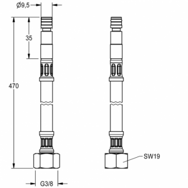 Tubo flexible de 470 mm y DN6 con conexión G 3/8, filtro y pasador, diseñado para instalaciones seguras y resistentes, evitando obstrucciones.