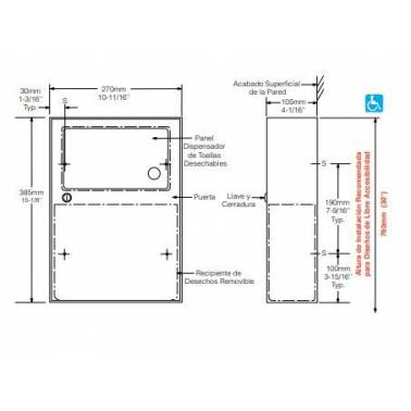 Cuenta con una cerradura con pestillo y una puerta de cierre automático que cubre la apertura donde se introducen las toallas a desechar.