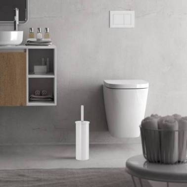 Elegante escobillero de suelo en acabado blanco mate. Viene con vaso interno alto extraíble para facilitar la limpieza.