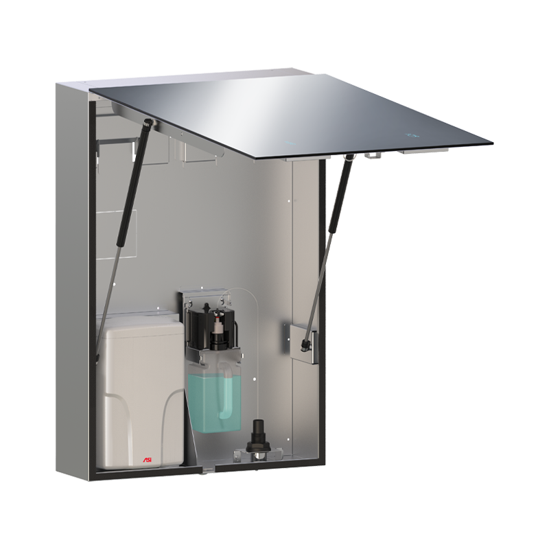 El armario de espejo Velare de ASI, con dispensador de jabón espumoso y secador de manos, es una solución integral que combina diseño, funcionalidad y tecnología avanzada. Este armario montado en superficie está fabricado en acero inoxidable tipo 304, proporcionando una construcción robusta y duradera. La puerta de espejo, fabricada en vidrio templado sin marco de 6 mm conforme a ASTM C-1048, tiene bordes de lápiz y esquinas suavizadas, garantizando una apariencia sofisticada y segura. El espejo está reforzado con un refuerzo intermedio de chapa de acero inoxidable y una placa posterior de acero inoxidable que asegura una larga vida útil. La bisagra de piano oculta de 3/16″ de diámetro facilita una apertura suave, mientras que el sistema de muelles de gas amortiguados permite una apertura de 15° a 90° con un cierre controlado, garantizando comodidad al usarlo. El armario oculta un dispensador automático de jabón espumoso manos libres con una capacidad de 1,5 L y un secador de manos de alta velocidad (110-120 V) equipado con un filtro HEPA, para garantizar un ambiente higiénico y eficiente. El espejo cuenta con luces retroiluminadas que funcionan a un voltaje de 100 - 240 VCA y se conectan a una toma cuádruple oculta en la parte posterior del armario. El dispensador de jabón requiere un jabón dentro de un rango de viscosidad de 0 - 100 mPa-s y un pH de 5.5 ~ 8.5. Dimensiones: 23-5/8″ x 35-7/16″ x 7-9/16″ (600 x 900 x 192).