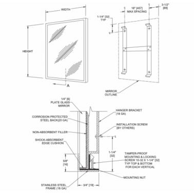 Espejo de placa de vidrio con marco angular Inter-Lok, fabricado con un resistente acero inoxidable 304 de calibre 18, garantizando durabilidad y resistencia a la corrosión. El marco, con dimensiones de 3/4″ x 5/8″ (19 x 16 mm), está formado en rollo con esquinas soldadas helicoidalmente, esmeriladas y pulidas hasta obtener un acabado satinado uniforme. La instalación es segura y práctica gracias a su soporte colgante oculto, que se bloquea en la parte superior e inferior del marco mediante tornillos de fijación antivandálicos. Su placa trasera de una sola pieza está unida al marco con un dispositivo de bloqueo antirrobo, proporcionando estabilidad adicional en entornos de alto tráfico. Dimensiones: 40" de ancho x 20" de alto.