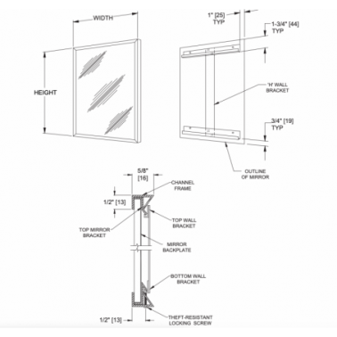 Espejo con marco Chan-Lok, diseñado para una instalación segura y resistente. Sus medidas son 16" de ancho x 24" de alto (406 x 610 mm). Fabricado con un canal de 1/2" x 1/2" (13 x 13 mm) de acero inoxidable tipo 304, calibre 20, con acabado satinado, el marco se forma por rodillo en una sola pieza que encierra el espejo y su respaldo con una esquina ingleteada de ajuste preciso. Este espejo se instala fácilmente en dos soportes de pared y se sujeta mediante tornillos antirrobo, ofreciendo una solución segura y funcional.