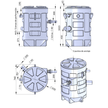 Está compuesto por un depósito de 280 litros fabricado en polietileno de alta densidad con tapa roscada y capacidad de resistencia puntual de hasta 200Kg, un kit hidráulico pre-instalado con una válvula antirretorno y llave de paso y por último una bomba sumergible con cuchillas trituradoras.