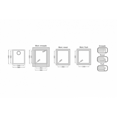 Fregadero Valencia de 34x40 cm, apto para instalación bajo encimera o enrasada en muebles de 40 cm. Compacto y versátil, combina estilo y practicidad en espacios pequeños.