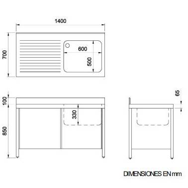 Mueble fregadero con una cubeta y escurridor a la derecha, bastidor de 700mm y puerta batiente 1400x700mm Nofer. Está fabricado en acero inoxidable AISI 304 acabado satinado. Construido con un material duradero y resistente. Apto para ser instalado en lugares con alta frecuencia de uso o instalaciones profesionales. Incluye válvula de desagüe y tubo rebosadero. Cubeta embutida con protección insonorizante. Disponible con escurridor a la derecha o situado a la izquierda. Bastidor de 600mm o de 700mm. Distintas medidas a elegir 1000, 1200, 1300 o 1400mm. El bastidor tiene 4 patas de tubo de 40x40mm con taco regulable de rosca oculta. Las patas traseras están avanzadas 50mm que permiten situarlo en suelos con radio sanitario. Se mont5a mediante tornillería allen (La llave viene incluida). Estructura desmontable para facilitar su transporte y almacenaje. Peto posterior de 100mm y frontal de 65mm. El fregadero no viene incluido.