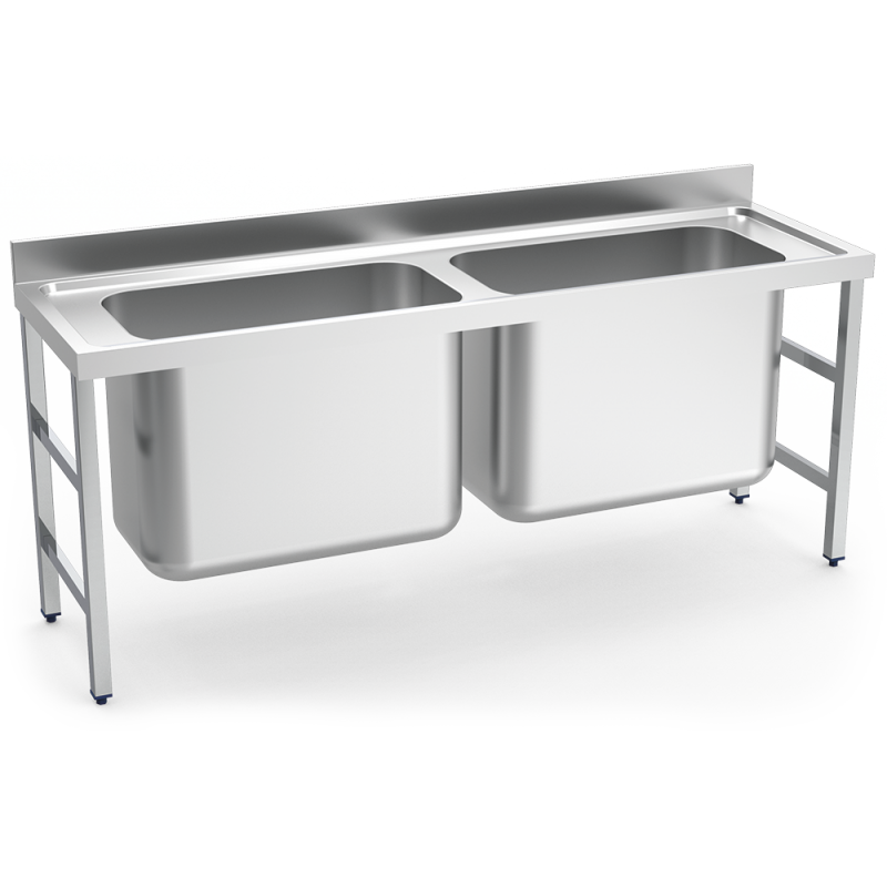 Fregadero de gran capacidad con dos cubetas. Totalmente fabricado en acero inoxidable con chapa de 1 mm de espesor y encimera con revorde salva-aguas. Sus dimensiones son de 2000x700x850 mm y las dimensiones de la cubeta son 800x500x600 mm