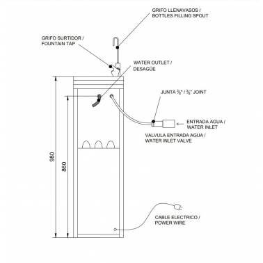 Fuente de agua fría con grifo llena-vasos y grifo pulsador fabricada en acero inoxidable AISI 304 acabado satinado con capacidad de 50 litros y depósito interior para almacenamiento de agua fría de 2 litros Nofer. Tipo conexión a red hídrica, con desagüe. Dispone de un termostato regulador de la temperatura del agua. Se acciona manualmente mediante un grifo pulsador/surtidor fabricado en latón cromado. Bandeja fabricada en acero inoxidable que recoge el agua sobrante y la desagua. El tubo salida de desagüe está a 850mm del suelo. Frontal de fácil acceso para la instalación de filtros (Los filtros no están incluidos). Conexión a la red eléctrica incluyendo clavija de toma de tierra. La potencia del compresor es 1/12 Hp. Potencia: 100 W. Refrigerante ecológico: R 134 A, la capacidad de refrigeración de agua es 50 litros/hora. Incluye rosca macho 3/8 “ para entrada de agua. Salida de agua tubo Ø 22mm. La fuente de agua es robusta, antivandálica y segura ya que está construida sin aristas, cortantes ni otros elementos peligrosos. Adecuada para colectividades y zonas públicas interiores de alta frecuencia de uso. Sus dimensiones son 980x310x305mm (Alto x Ancho x Fondo)