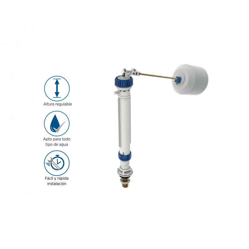 Versión con boya de espuma, ligera y eficiente. Alimentación inferior con diseño telescópico ajustable. Casquillo de latón 3/8" para mayor durabilidad. Llenado suave y silencioso. Ideal para reemplazos y nuevas instalaciones.