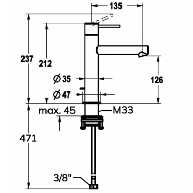Grifo mezclador de lavabo modelo ONO E A135, sin válvula de desagüe, con una palanca superior y caño fijo en cromo. Este modelo es adecuado para un baño de estilo moderno, brindando un control preciso del agua.