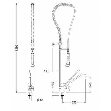 Columna con monomando mezclador con maneta larga gerontológica para pre-lavado profesional completa.