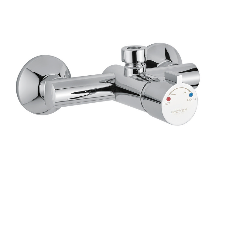 El mezclador temporizado termostático 908 para ducha de pared con pulsador de la marca Idral ofrece un control avanzado y un diseño robusto para baños modernos. Fabricado en latón cromado, garantiza resistencia y un acabado estético de alta calidad. Su funcionamiento se gestiona mediante una maneta, que permite el control preciso de la mezcla de agua gracias a su cartucho termostático progresivo TMV3, asegurando una temperatura constante. Dispone de un bloqueo de seguridad para limitar la temperatura máxima a 38°C, ajustable según las necesidades del usuario. Incorpora válvulas de retención con limitadores de caudal de 9 l/min y filtros en la alimentación, proporcionando eficiencia y protección frente a impurezas. Este grifo es compatible con una presión de alimentación entre 1 y 5 bar, y permite trabajar con agua caliente entre 50 y 63°C (55-60°C recomendado) y agua fría entre 5 y 20°C. La temperatura mínima diferencial entre agua caliente y mezclada es de 10°C, con una tolerancia de regulación de +/- 2°C. Su tiempo de descarga está fijado en 15 segundos a 3 bar, con una tolerancia de +/- 5 segundos. Este mezclador es ideal para proyectos que buscan combinar funcionalidad, eficiencia y seguridad en baños modernos.