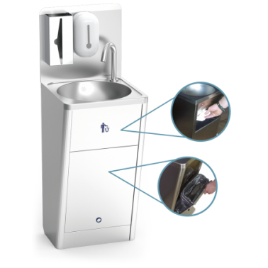 Lavamanos integral registrable electrónico de agua fría y caliente. Tiene una papelera integrada en su interior con un peto trasero. Dispensador de jabón en acero inoxidable con capacidad de 0'8 litros y dispensador de toallas en acero inoxidable. De 450x450x1250 mm