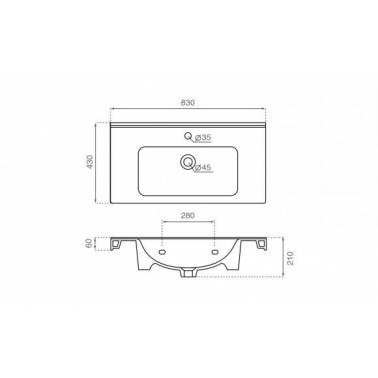 Lavabo sobre encimera suspendido con rebosadero. Medidas: 830x430x210 mm.
