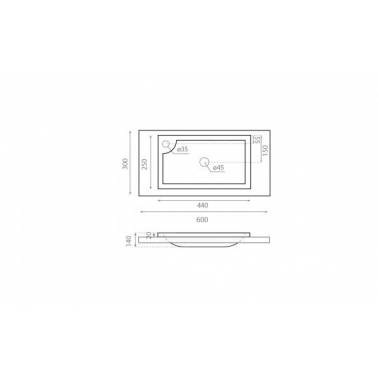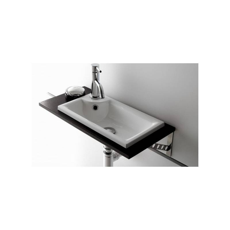 Lavabo de resina con estante fabricado en madera Bathco. Incluye unos soportes fabricados en acero para poder colocar el estante a la pared. El lavabo modelo Niza tiene unas dimensiones de 440x250x140mm y el estante es de 600x300x16mm