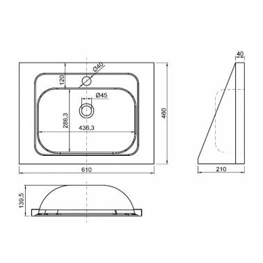 Sus dimensiones son 210x610x460mm (Alto x Ancho x Fondo) y el orificio rebosadero tiene un diámetro de Ø40mm