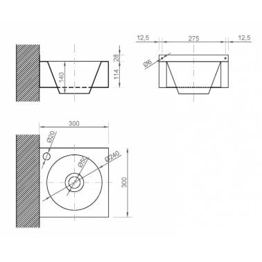 Lavamanos a pared cuadrado fabricado en acero inoxidable AISI 304 acabado brillo con orificio para grifo y dimensiones 300x300 Nofer. Disponible en dimensiones 300x300mm y más grande de 380x380mm. Está fabricado en un material resistente a la corrosión, duradero y con acabados antivandálicos. Apto para ser instalado en colectividades y lugares con alta frecuencia de uso. Fijación a pared atornillada mediante dos orificios de Ø 6mm. No incluye válvula de desagüe ni sifón. El orificio para el grifo tiene un diámetro de Ø20mm. Sus dimensiones son 140x300x300mm (Alto x Ancho x Fondo)