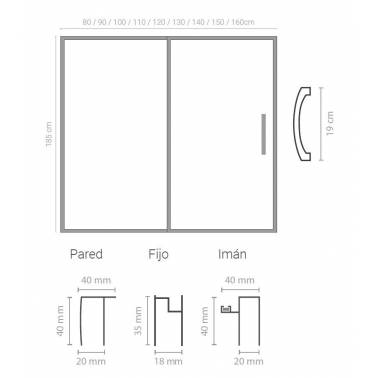 Mampara de ducha fija con puerta corredera de 120x185cm Komercia. Mampara frontal con un fijo y una puerta corredera reversible. Lado expansor igual para todas las medidas 78-80’5cm. Si quiere añadir serigrafía consultar. Disponibles también en otras medidas. Mampara de vidrio templado transparente con 5mm de grosor. Los perfiles están fabricados en aluminio acabado cromado y de forma ovalada. Tirador fabricado en acero inoxidable cromado reversible con imán de 19cm