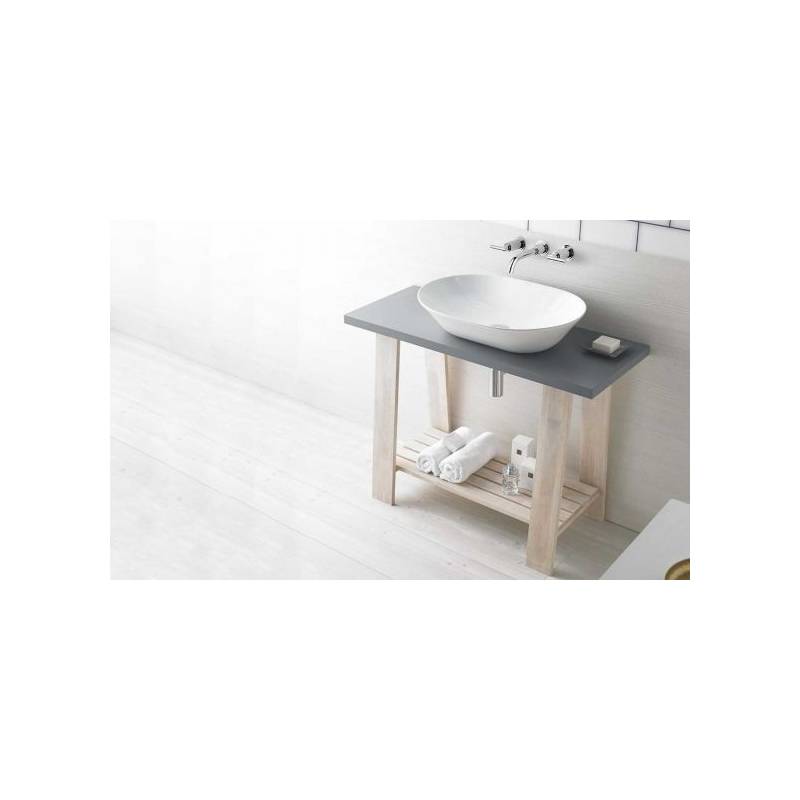 Mueble de baño de estilo nórdico Bathco. La estructura del mueble está fabricada en madera natural y la encimera puede ser de color blanco, negro o gris. Las dimensiones del mueble son 1000x400x730mm