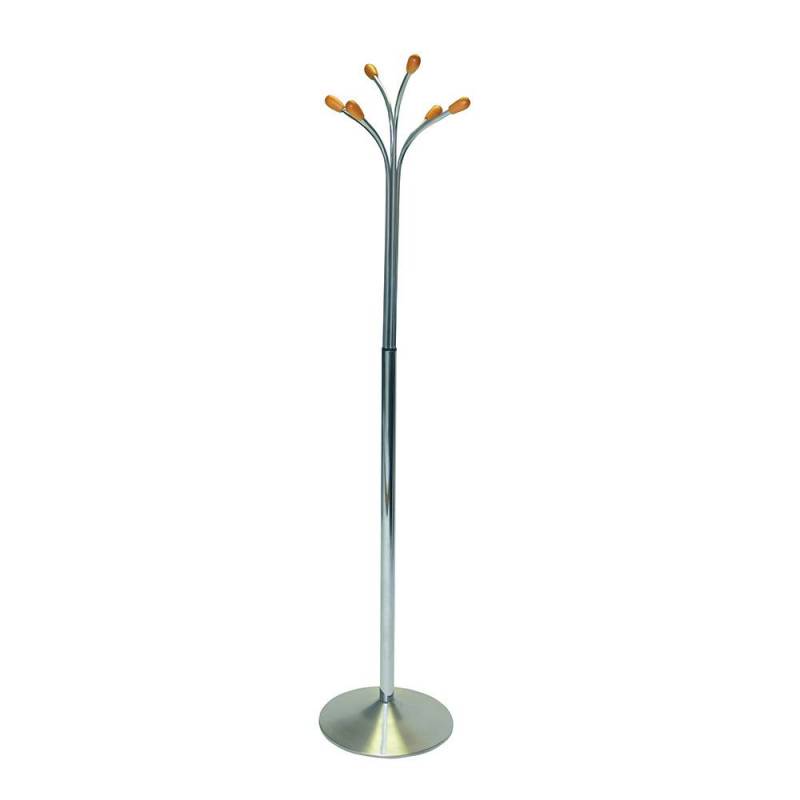 Perchero metálico cromado con seis colgadores de madera de haya. Peso: 7,20 kg.