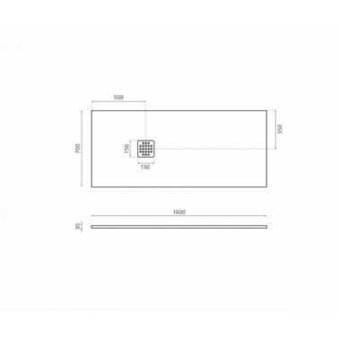 Plato de ducha de gran tamaño, 160x70 cm con 3 cm de espesor, con orificio de desagüe lateral. Acabado blanco para un diseño limpio y elegante.