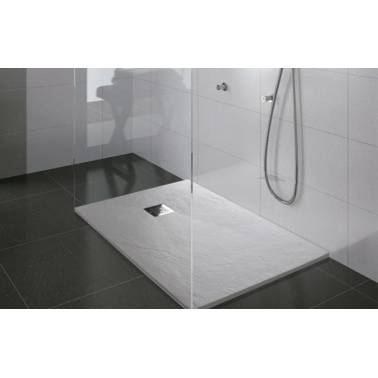 Plato de ducha antideslizante Marina de 100x70 cm con textura pizarra en blanco y marco. Superficie antideslizante y elegante, que combina seguridad y modernidad para cualquier baño.