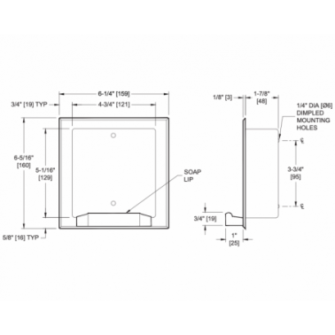 La jabonera empotrada de acero inoxidable brillante marca ASI es una solución práctica y duradera para baños modernos. Su construcción sin costuras de una sola pieza, fabricada en acero inoxidable de calibre 22 tipo 304, garantiza resistencia a la corrosión y una apariencia brillante que realza el diseño del espacio. Está provista de un labio elevado que ayuda a retener el jabón de forma segura, evitando deslizamientos. Las dimensiones generales son 6-1/4" x 6-5/8" x 2" (159 x 160 x 51 mm), mientras que la abertura de pared rugosa requerida es de 5-1/2″ x 5-1/2″ x 2″ (140 x 140 x 51 mm). Este producto es ideal para instalaciones en paredes de yeso seco, ofreciendo funcionalidad y diseño minimalista.