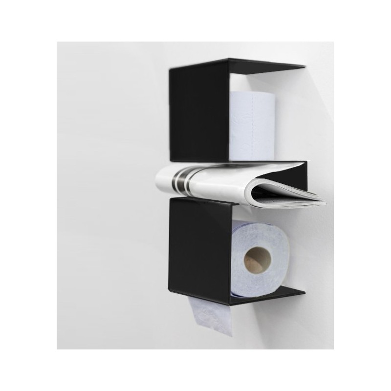 Portarrollos doble con estantería Nina en aluminio negro mate. Un diseño sofisticado que brinda funcionalidad y un toque moderno al espacio. MEDIDAS: 120x120x300 mm.