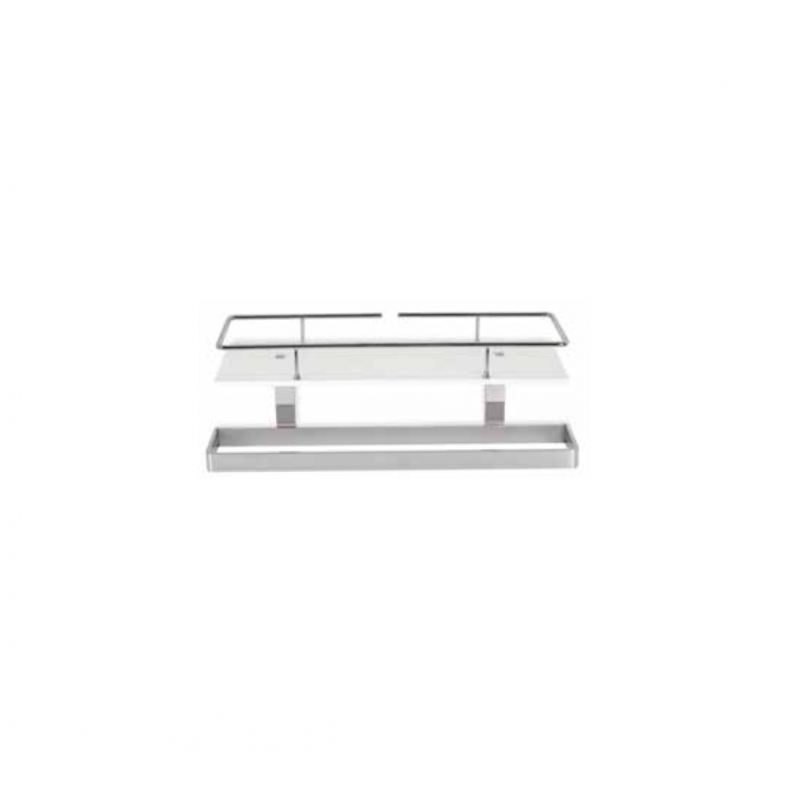 Estantería TURÍN con toallero y defensa, fabricada en acero cromado con solid surface en blanco. Brinda un espacio seguro y práctico para accesorios y toallas.