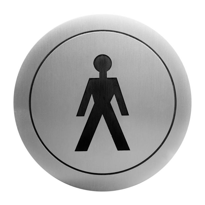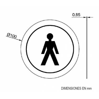 Pictograma de Hombre con fijación auto adhesiva en la pared fabricado en acero inoxidable AISI 304 acabado satinado Nofer. Está fabricado de un material resistente y duradero. Sus dimensiones son Ø100mm de diámetro y 0'85mm de ancho.