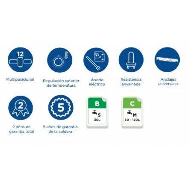 Tiene un piloto de funcionamiento y una válvula de seguridad tarada a 10 bar. Dos años de garantía total y cinco años de garantía de la caldera sin tener que cambiar el ánodo.